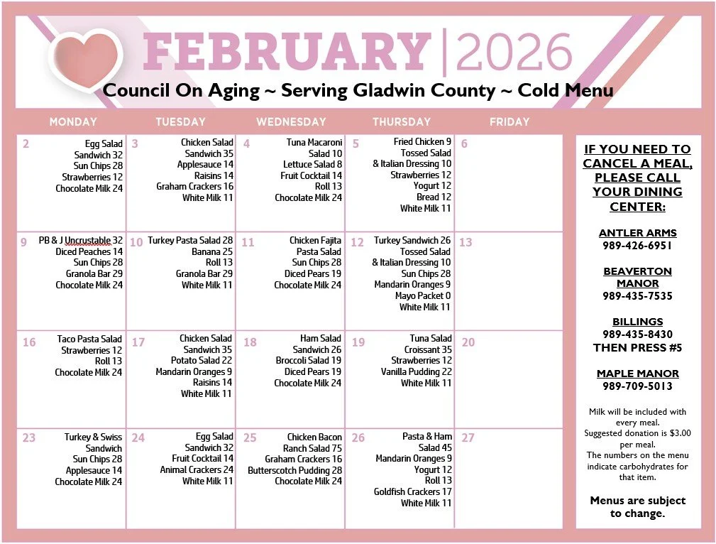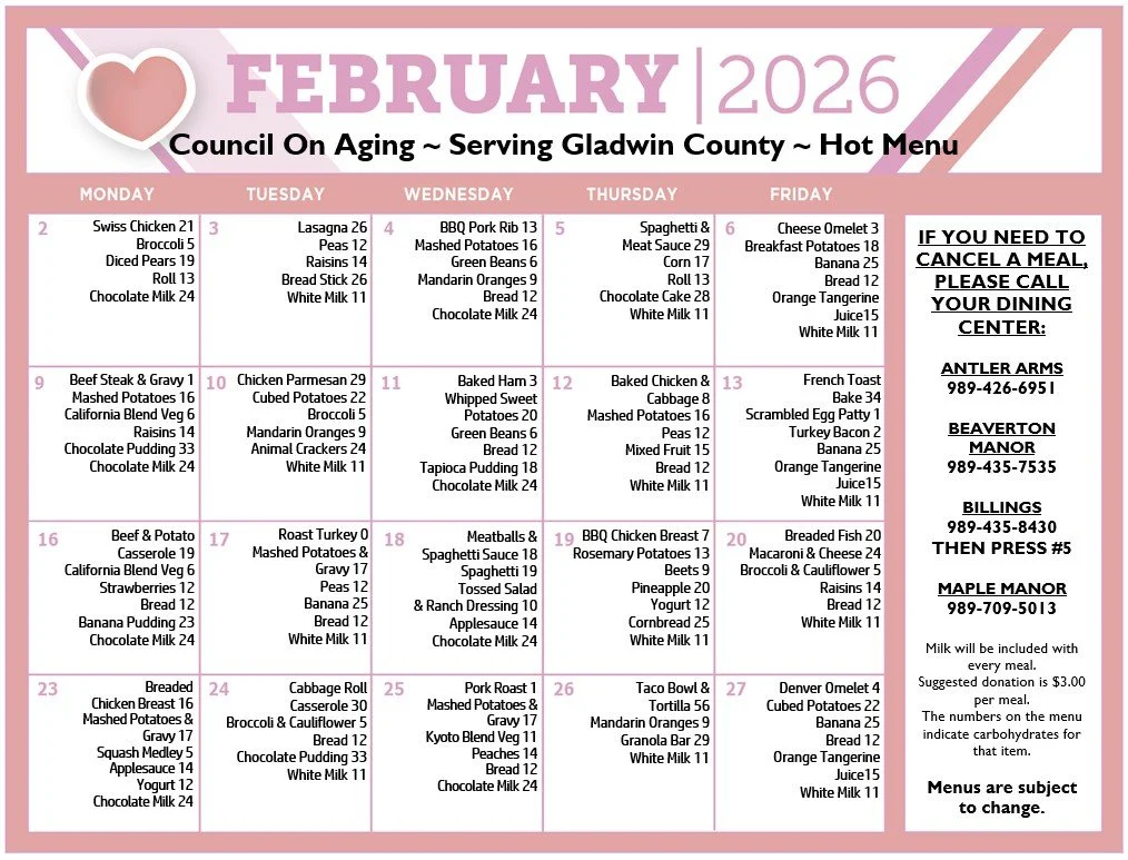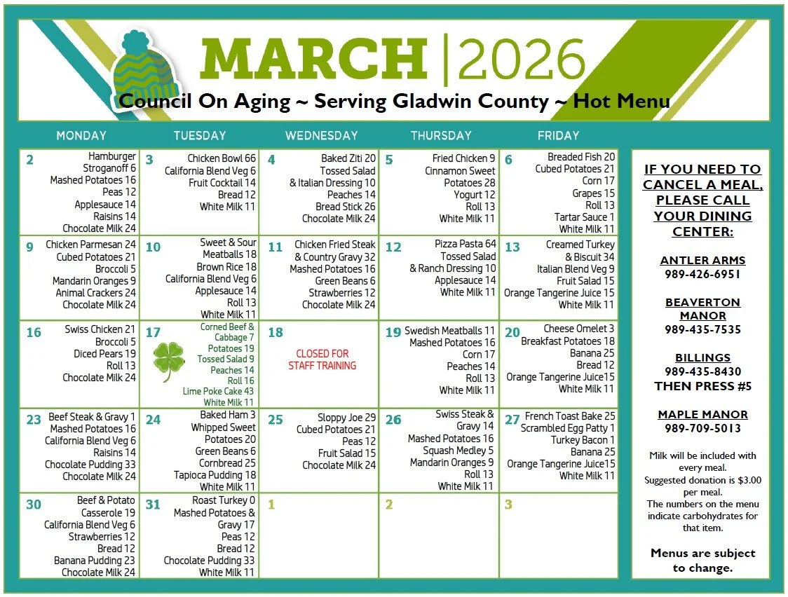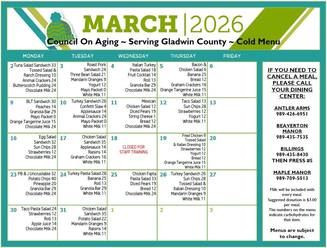 Our Home Delivered Meals Program/Meals on Wheels delivers hot and cold meals to homebound seniors Monday through Friday and frozen meals for the weekends. Our Congregate meal program provides the same hot and cold meals to seniors who are not homebound Monday through Friday. Each month, a new meal calendar is created and disbursed to all meal clients.